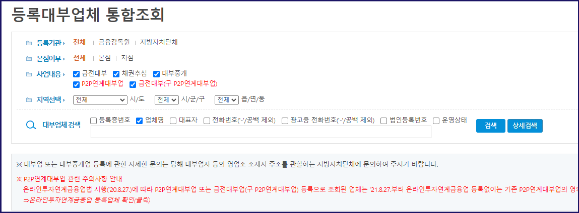 대부중개업의 경우에도 금감원에서 정식 등록 여부를 확인하여 볼 수 있습니다. 그리고 일부 대형 업체에서는 대부업과 대부중개업을 동시에 등록하여 진행하기도 합니다.