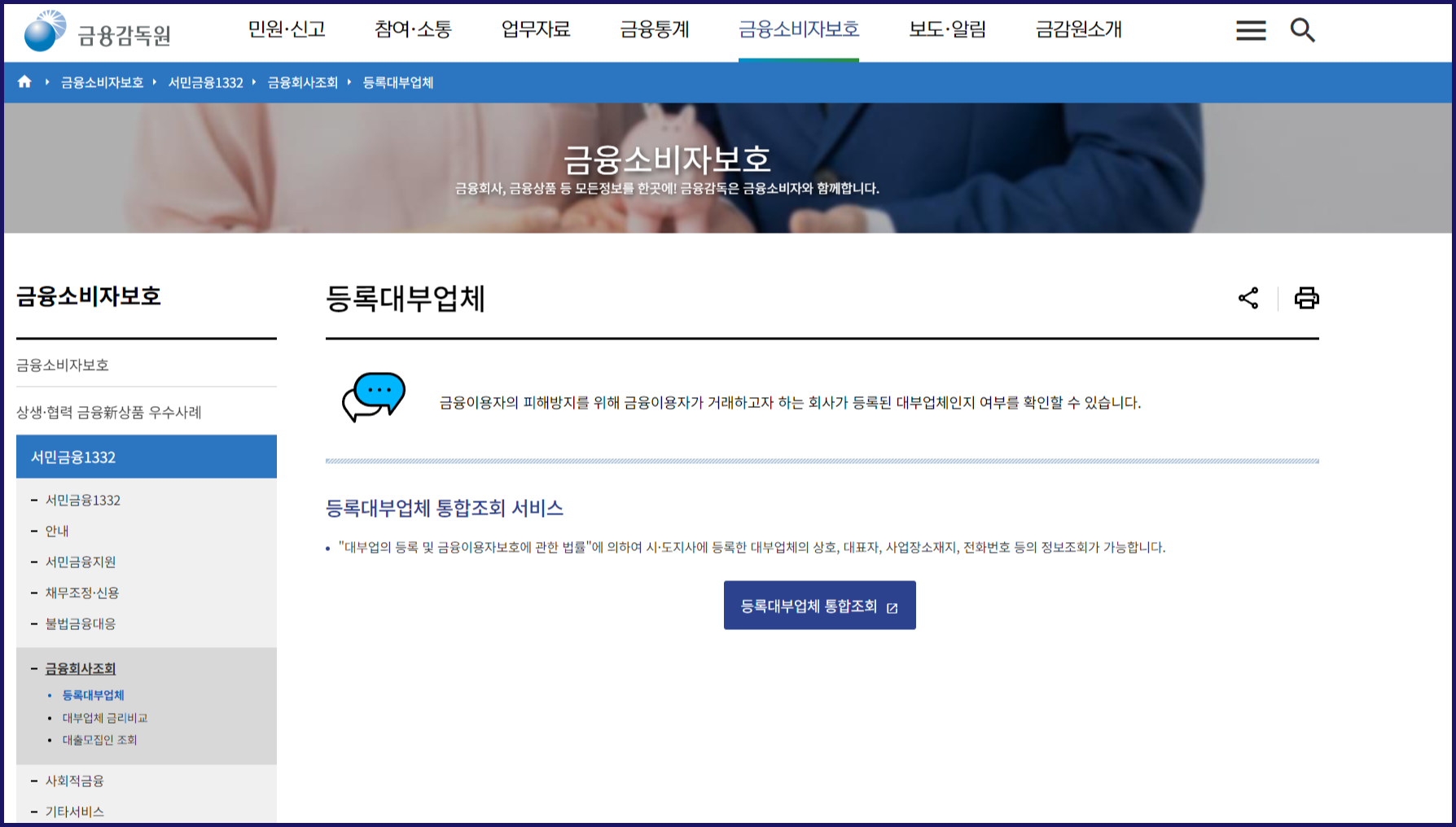 1. 금감원 등록대부업체 조회 홈페이지 접속