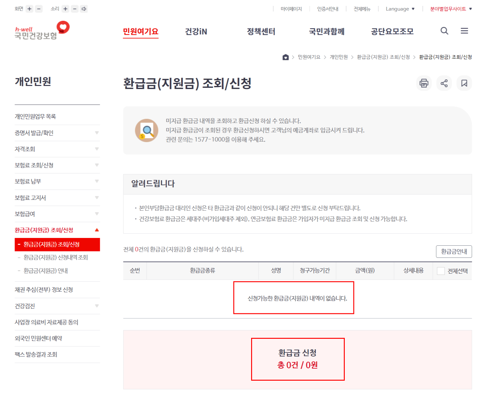 국민건강보험 환급금 조회를 통해서 내가 환급받을 수 있는 금액을 확인하고, 나의 계좌로 환급신청하여 지급받을 수 있습니다.