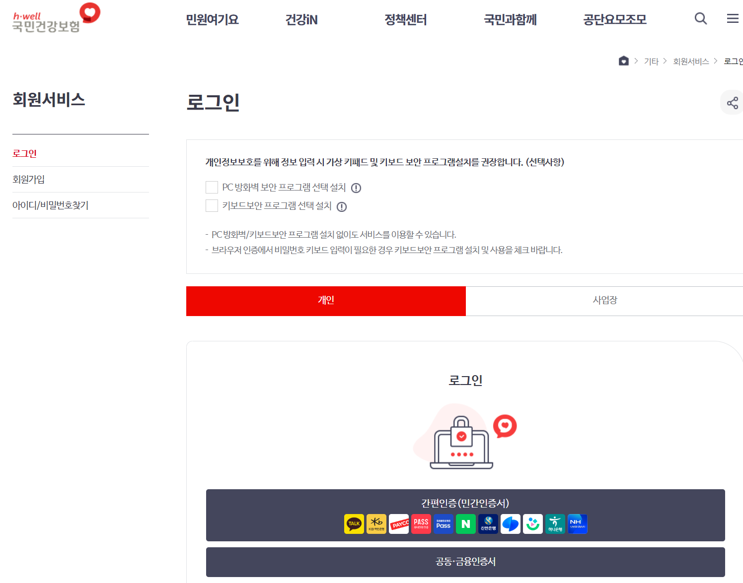 본인인증을 통한 로그인이 진행되어야 국민건강보험 환급금 조회 및 신청이 가능하므로, 반드시 로그인을 진행하여야 합니다. 로그인은 간편인증 혹은 인증서 로그인으로 진행할 수 있으니 편리하게 진행할 수 있으리라 생각됩니다.