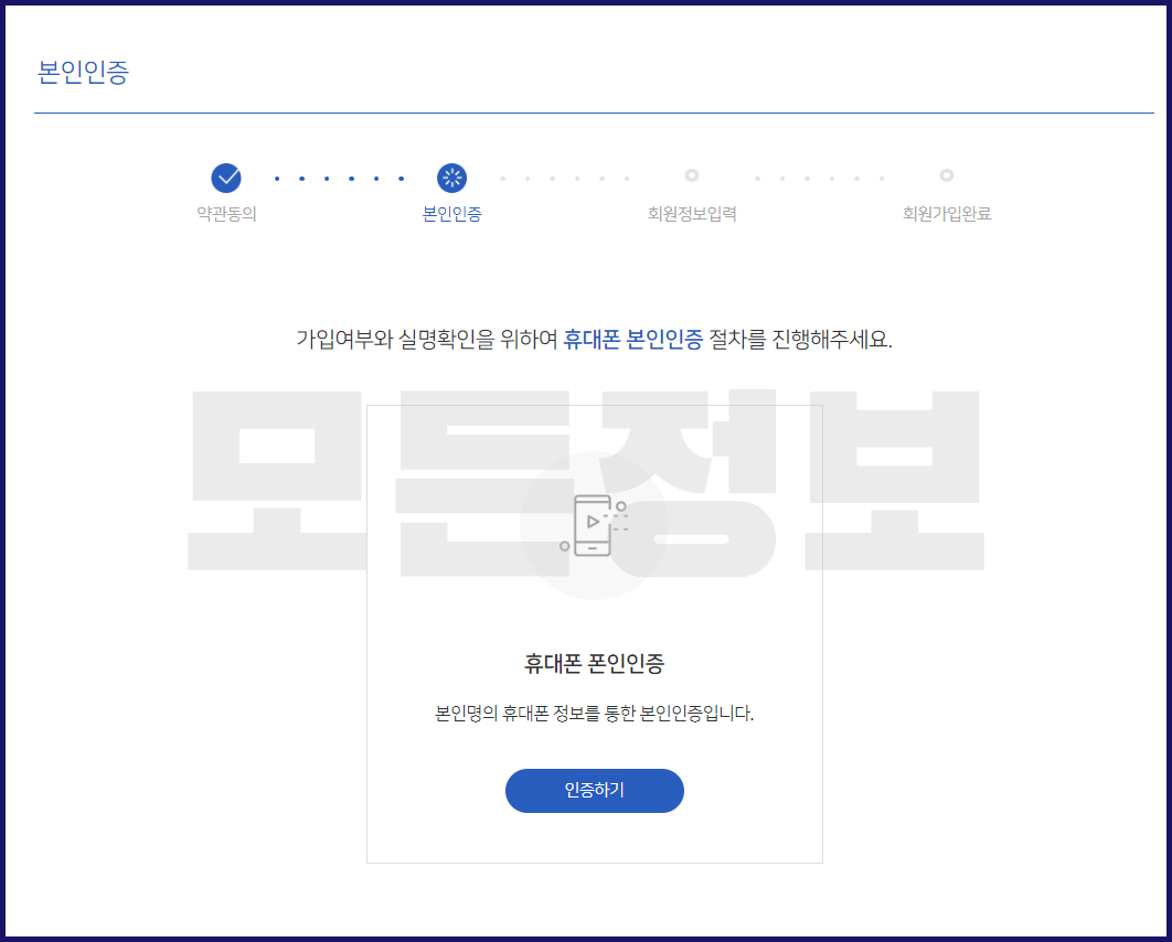 가입여부와 실명확인을 위하여 휴대폰 본인인증 절차를 진행합니다.