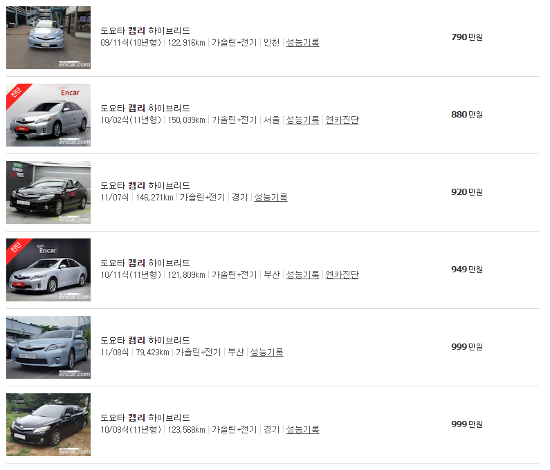 1세대 캠리 모델의 하이브리드 차량은 현재 엔카에서 6대가 판매중에 있습니다. 2009년부터 시작하여 2011년식가지 등록이 되어있는데, 이중 주행거리10만km 차량은 단 1대가 등록이 되어 있습니다.