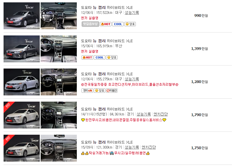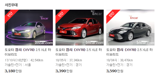 이상으로 도요타 캠리 하이브리드 중고차 가격 및 시세에 대해서 한번 살펴 보았습니다. 결코 싸고 좋은 차량은 없습니다. 이제는 소비자가 스스로 발품을 팔아야 더 좋은 차량을 구매하는 시기 입니다. 온라인을 통해 다양한 차량을 직접 체크해 보고 반드시 실매물로 확인 하시어 좋은 차량 구매를 하시길 바랍니다.