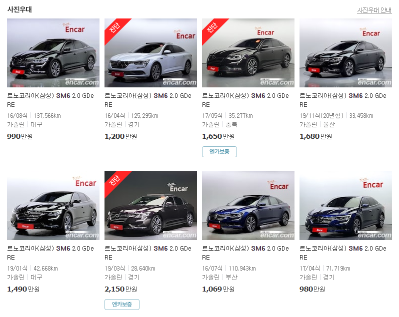 중고차로 SM6를 구매할때 선호도가 높은 모델은 가장 높은 등급인 RE모델인데요. LPE 모델 중 RE등급의 차량은 1,290만원부터 2,099만원까지 형성이 되어 있습니다.