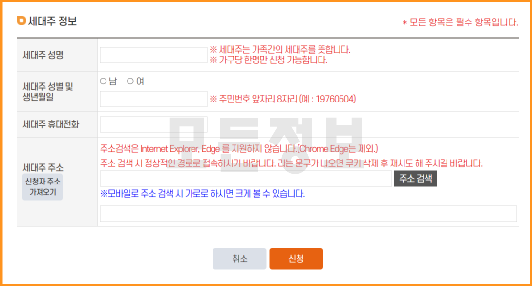 신청자 본인 정보와 세대주의 정보를 입력하여 하단의 신청 버튼을 선택하여 안심소득 신청을 하실 수 있습니다.
