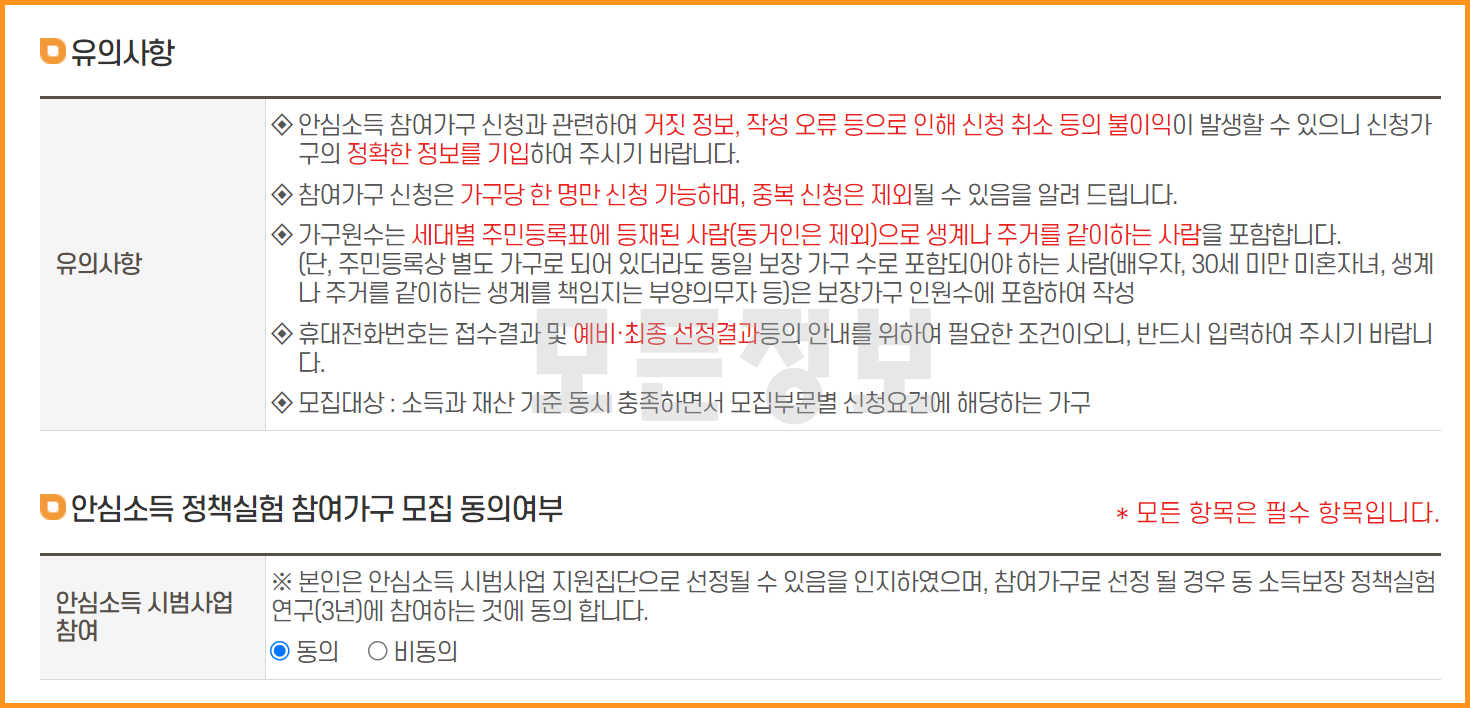 안심소득 신청관련 유의사항을 확인하신 뒤 아래의 모집 동의여부를 선택합니다.