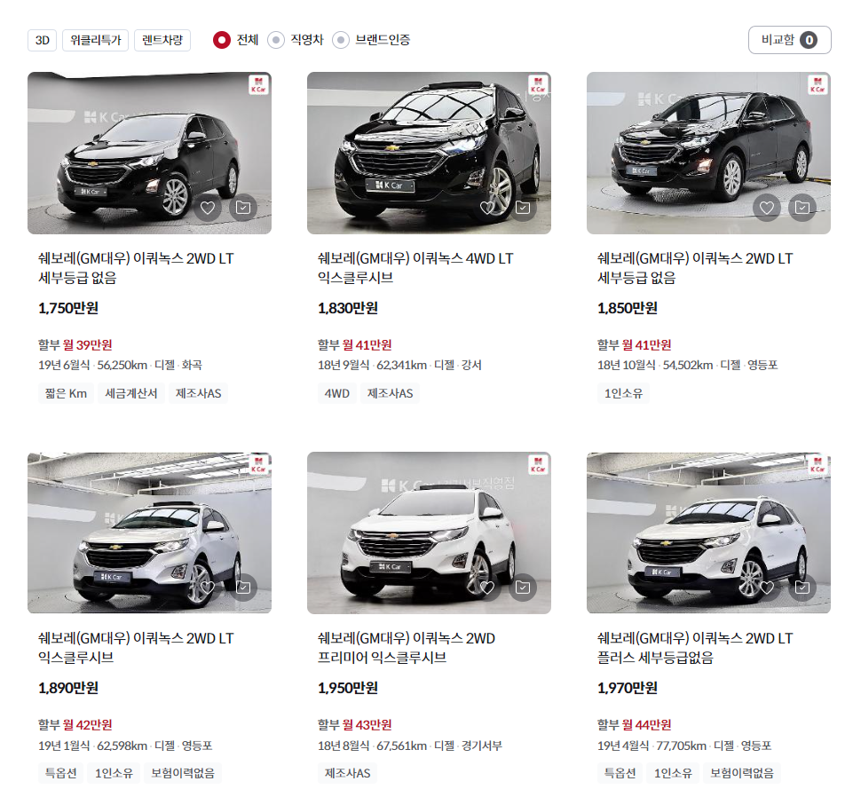 쉐보레 이쿼녹스 중고 가격 : 1,750만원 ~ 2,830만원(K-Car)