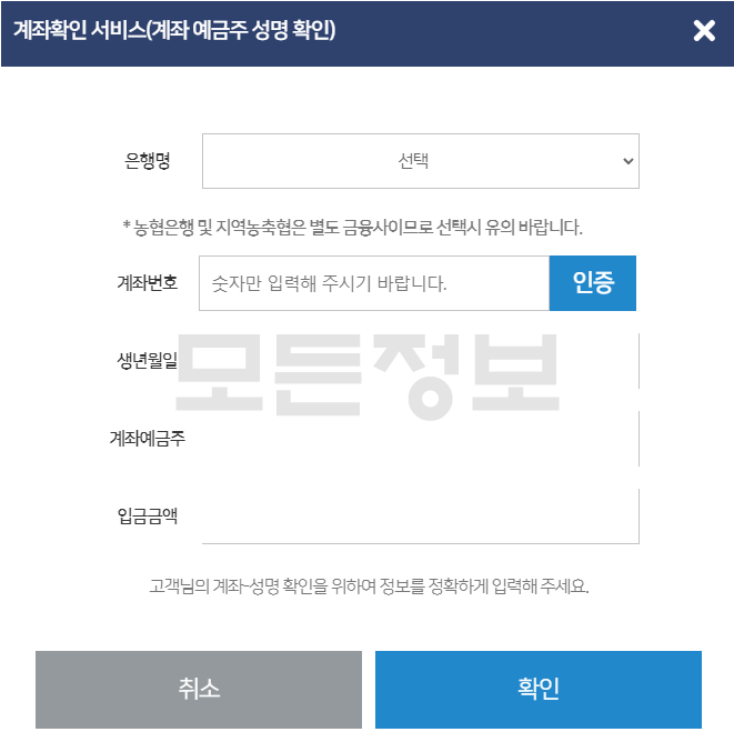 7. 계좌입금을 위한 본인확인 서비스 인증을 진행합니다.(회원가입이 되어 있는 경우에도 한번더 인증을 하셔야 합니다.)