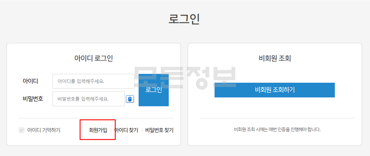 2. 로그인을 위하여 회원가입을 선택합니다.(비회원 조회하기로 진행하셔도 무방)