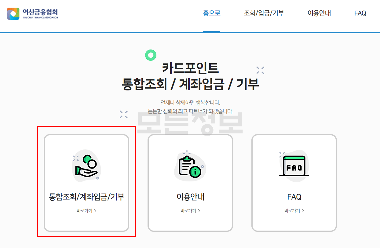 1. 여신금융협회 카드 포인트 통합조회 홈페이지 접속하여 통합조회/계좌입급/기부 메뉴를 선택합니다.