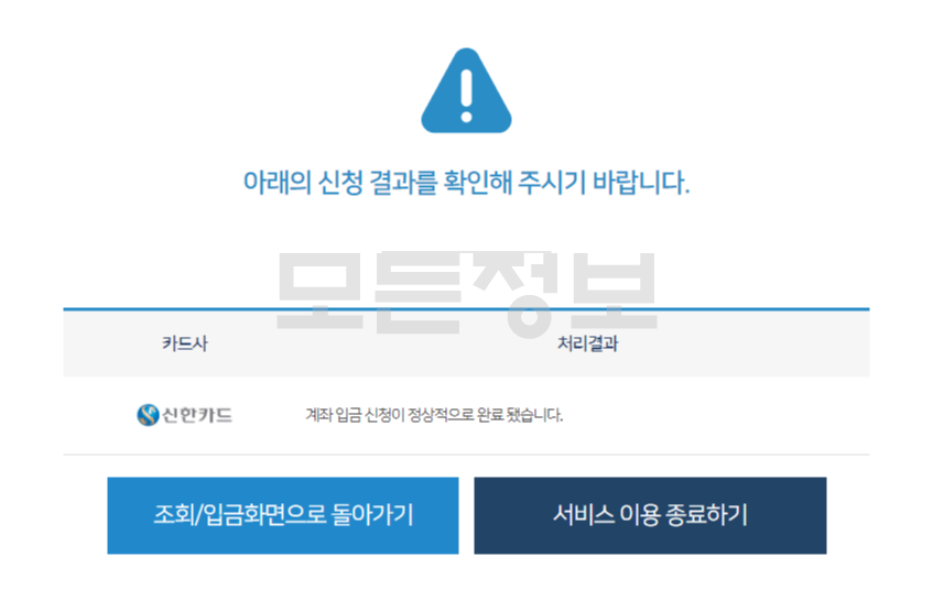 9. 신청결과 확인. (신한카드의 경우 신청과 동시에 계좌롸 입금이 되었습니다.)