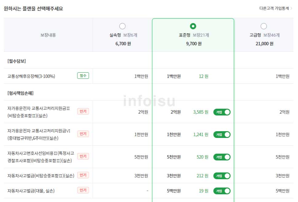 KB 운전자보험 플랜별 보험료