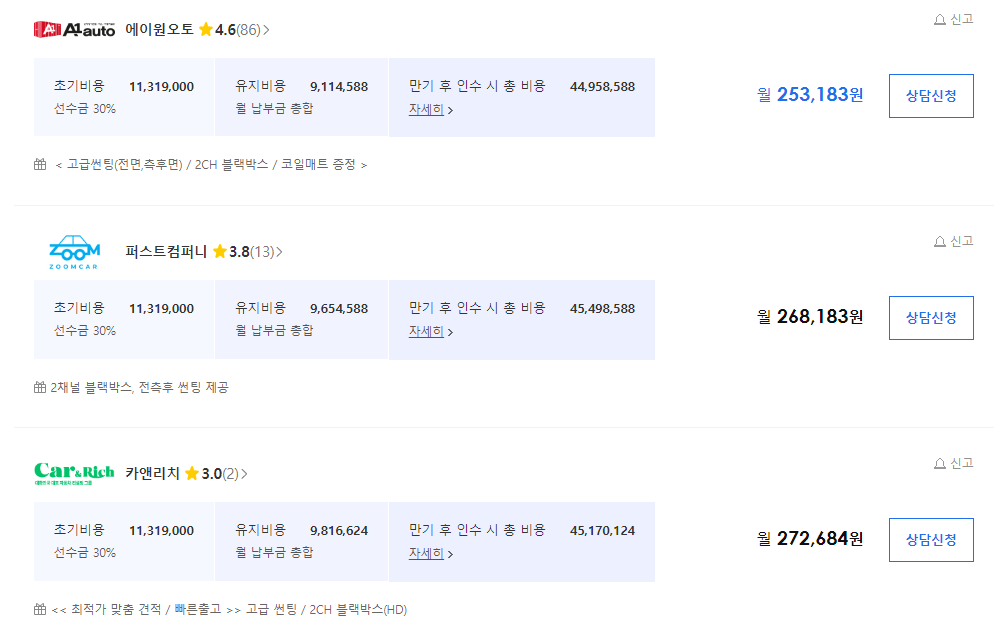 자동차 리스 가격표
