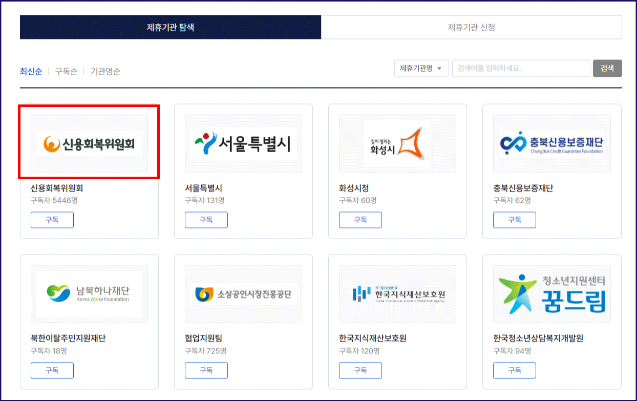 제휴기관 탐색 메뉴에서 신용회복위원회를 선택합니다.