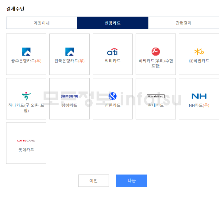 ⑦ 결제수단 선택(계좌이체, 신용카드, 간편결제)
