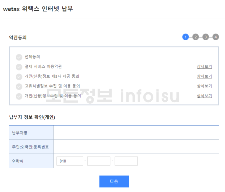 ⑥ wetax 위택스 인터넷 납부를 위한 약관 동의 및 납부자 정보 확인(이름, 주민등록번호, 연락처)