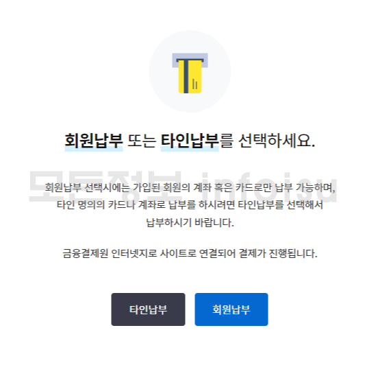 ⑤ 납부하기 버튼 클릭하여 타인납부 혹은 회원납부 선택(타인의 계좌 및 카드로 납부하는 경우에는 타인납부를 선택하여 진행해야 하며 본인 계좌 및 카드로 납부시 회원납부 선택)