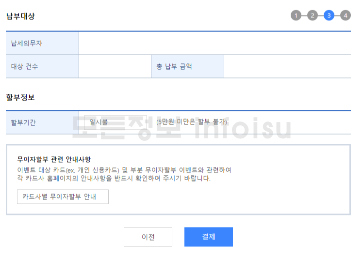 ⑧ 납부대상(납세의무자, 대상 건수, 총 납부 금액)확인 하여 할부정보 선택 후 결제 클릭