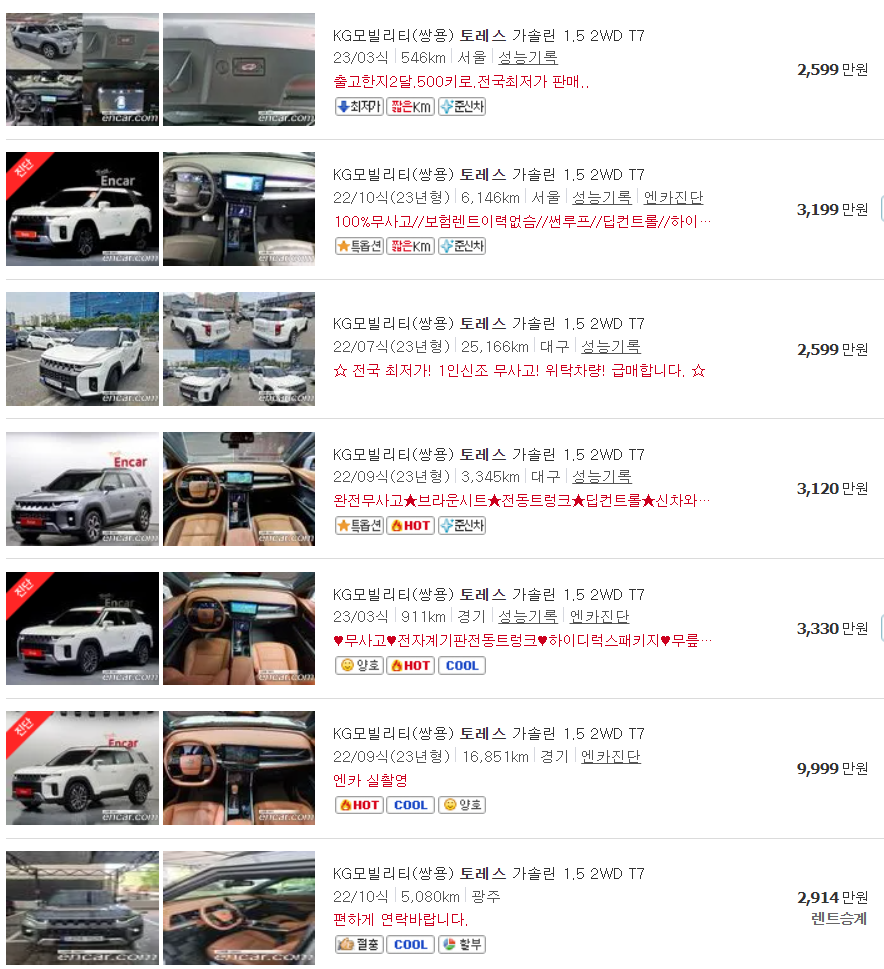 만약 토레스 중고차 가격을 알아보고, 매매를 희망하는 분들께서는 보다 다양한 중고차 매물 시세를 직접 확인해 보시라고 말씀드리고 싶습니다.