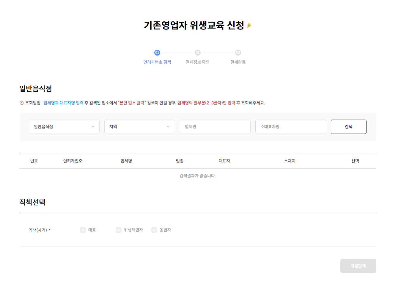 지역, 업체명, 대표자명으로 검색을 하여 인허가번호를 검색하여 선택합니다.