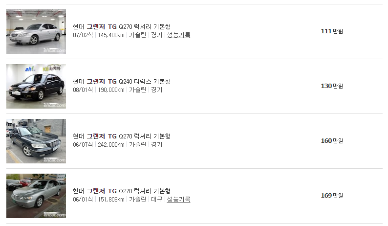 가장 저렴한 금액으로 가격이 측정되어 있는 그랜저 TG의 경우 08년 1월식 Q240 디럭스 기본형의 차량으로 주행거리는 19만 km의 검정색 차량입니다.
