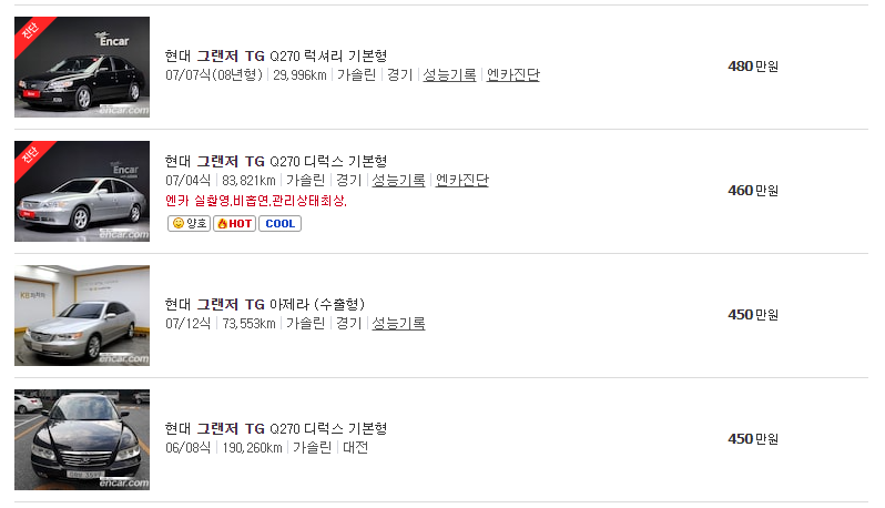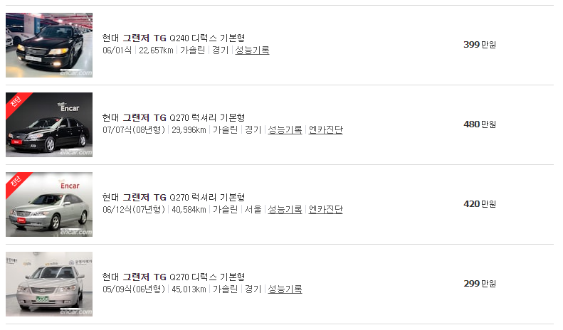 이상으로 그랜저 TG 중고차 가격에 대해서 한번 알아보았습니다. 년식이 어느정도 있는만큼 금액은 상당히 저렴하다는 장점이 있으나, 중고매물인만큼 최대한 관리가 잘 되어진 차량으로 구매를 하는 것이 좋아 보입니다.