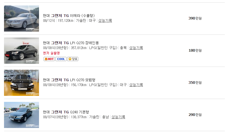 엔카기준 그랜저 TG는 LPG 타입차량이 34대가 판매중에 있으며, 가솔린 2700cc 이하의 차량은 137대 가솔린 3300cc 차량의 경우 18대가 등록이 되어 있습니다.