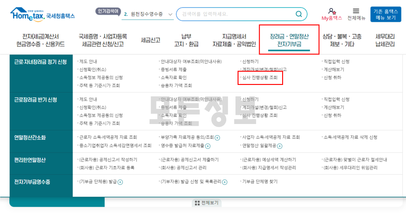 3. 장려금 연말정산 전자기부금 메뉴에서 심사 진행상황 조회 선택