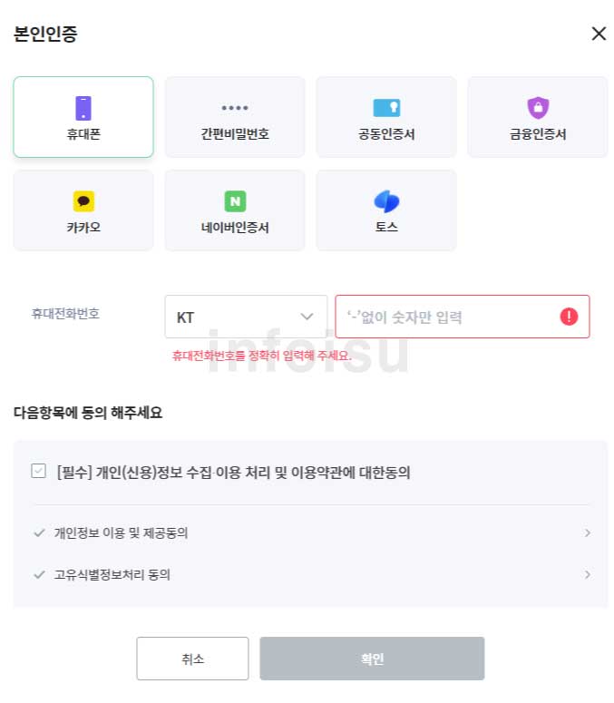 3. 본인인증(원하는 인증 수단을 선택하여 진행)