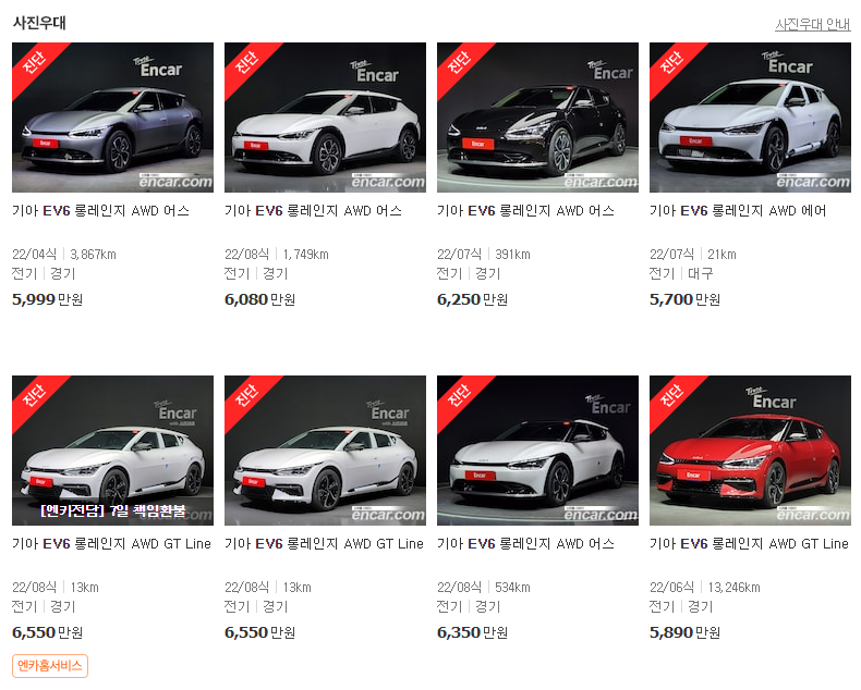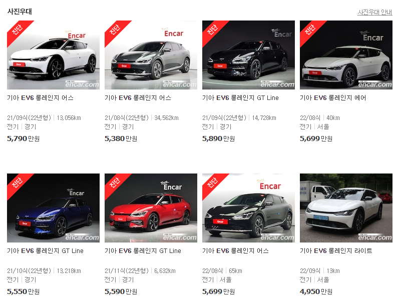 보다 다양한 ev6 중고차 가격 및 시세표를 확인해보고 싶다면, 아래에서 실시간으로 확인을 해보는 것이 좋습니다. 중고차는 결국 본인이 발품을 많이 팔수록 보다 유리한 조건에 구매가 가능하다는 점을 간과해서는 안될 것입니다.