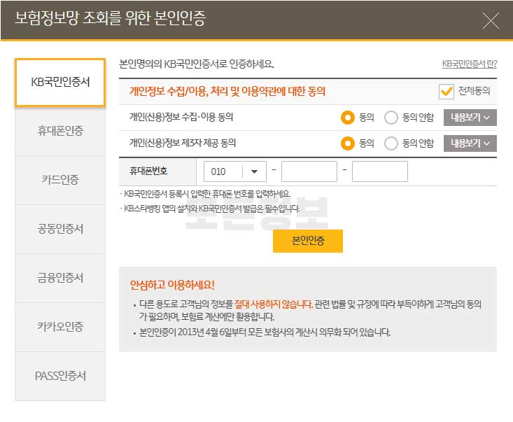 4. 보험정보망 조회를 위한 본인인증(KB국민인증서, 휴대폰, 카드, 공동, 금융, 카카오, PASS 중 선택)