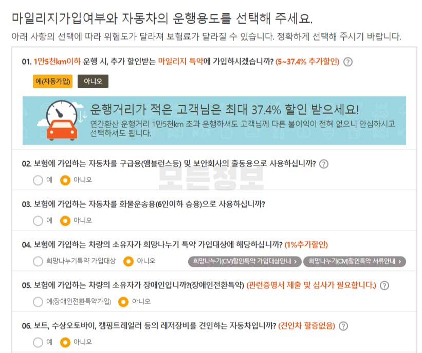 6. 마일리지 가입여부 및 자동차의 운행용도에 대한 내용 확인후 체크
