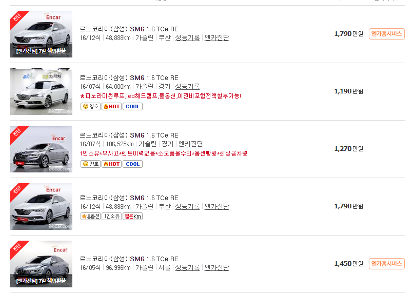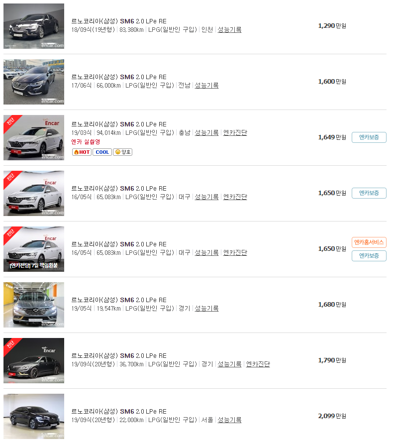 중고차로 SM6를 구매할때 선호도가 높은 모델은 가장 높은 등급인 RE모델인데요. LPE 모델 중 RE등급의 차량은 1,290만원부터 2,099만원까지 형성이 되어 있습니다.